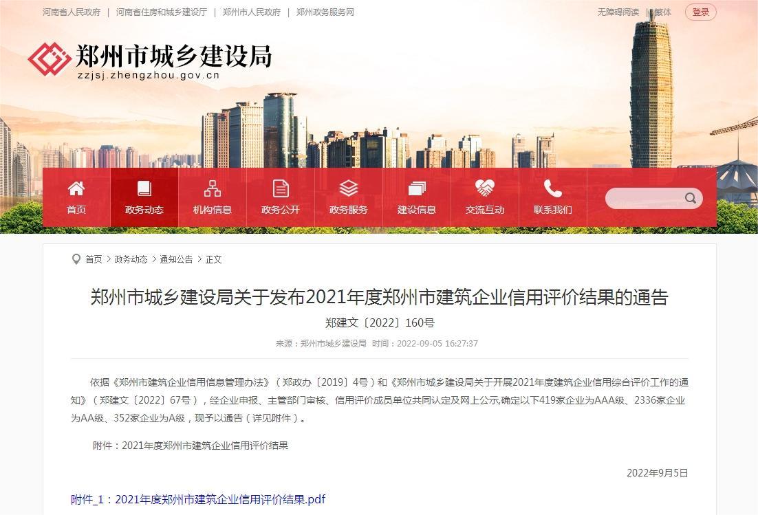 9月5日,鄭州市城鄉(xiāng)建設(shè)局公布了“鄭州市城鄉(xiāng)建設(shè)局關(guān)于發(fā)布2021年度鄭州市建筑企業(yè)信用評價結(jié)果的通告”。經(jīng)主管部門審核、信用評價成員單位共同認(rèn)定,我公司榮獲鄭州市工程造價AAA級企業(yè)、鄭州市工程招標(biāo)代理AAA級企業(yè)、鄭州市工程監(jiān)理AA級企業(yè)。