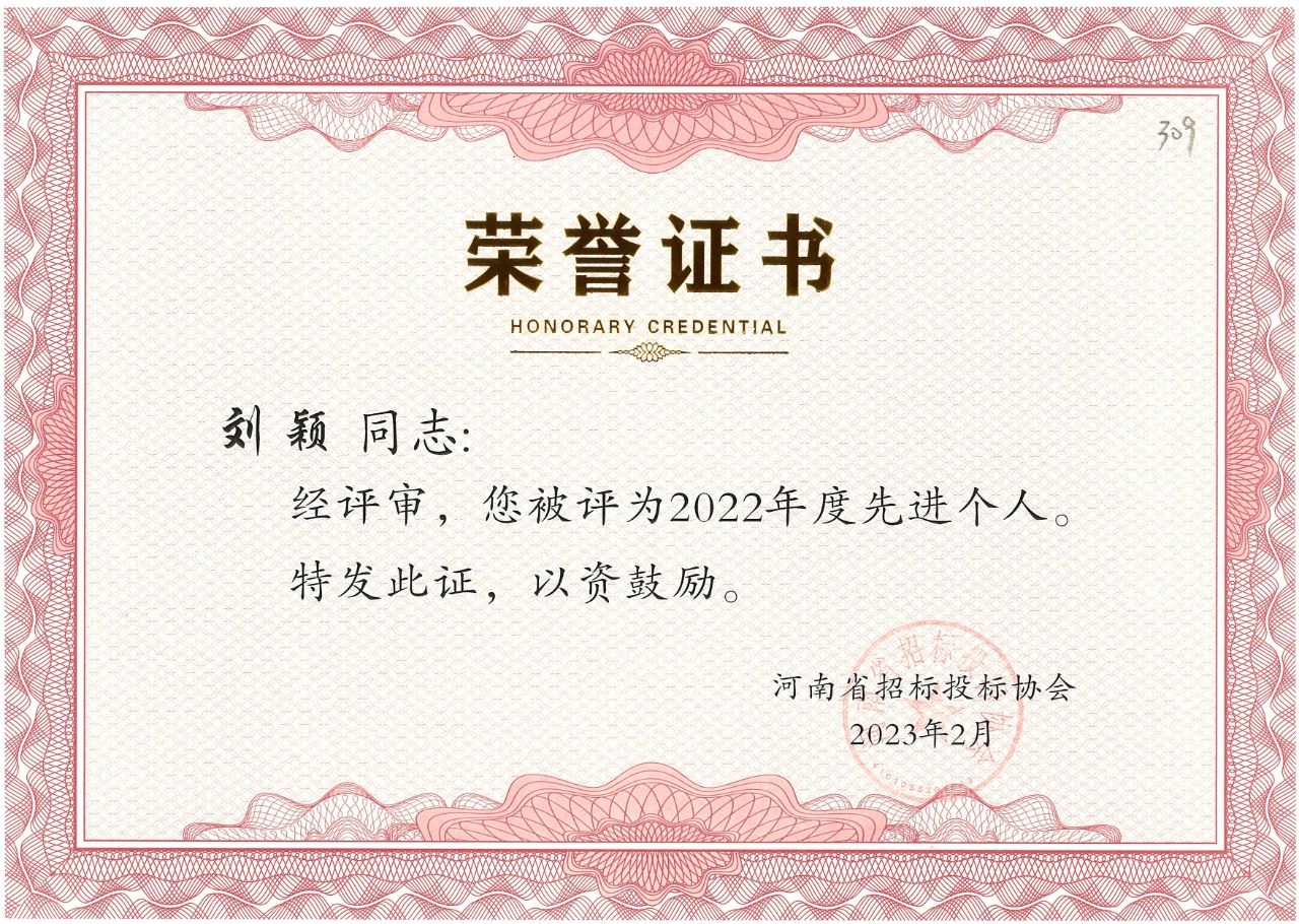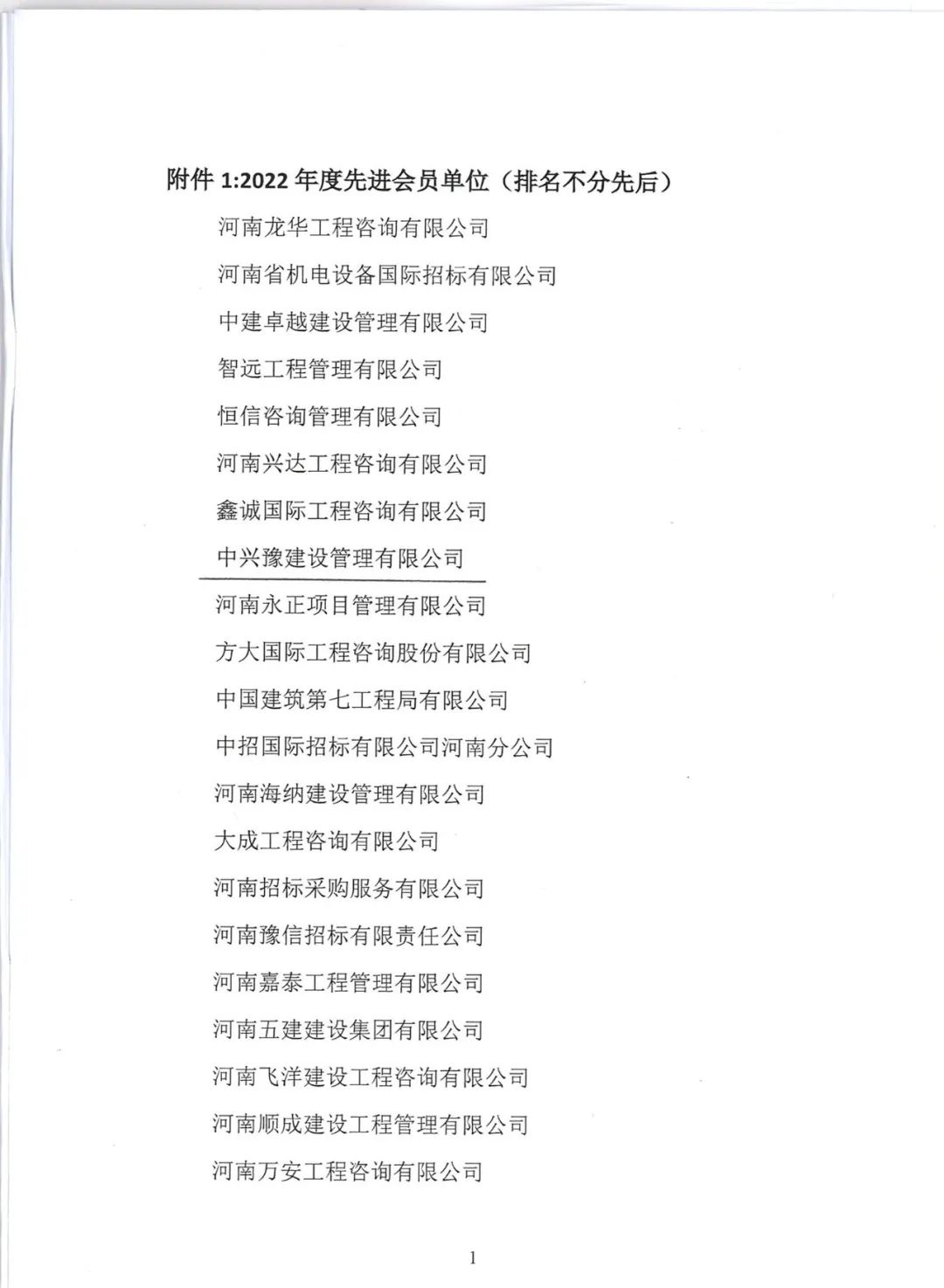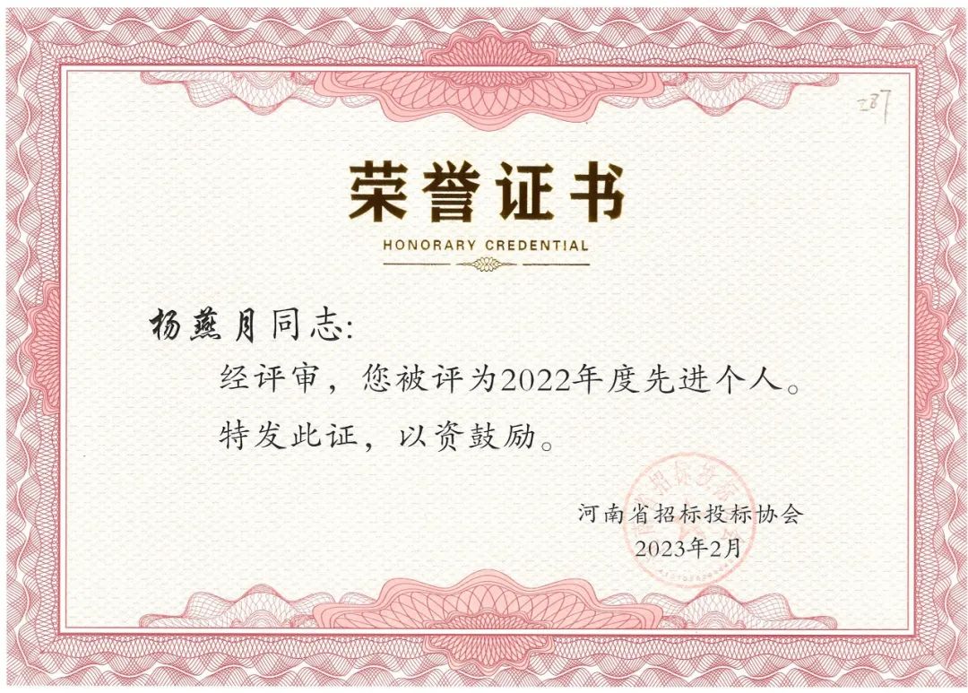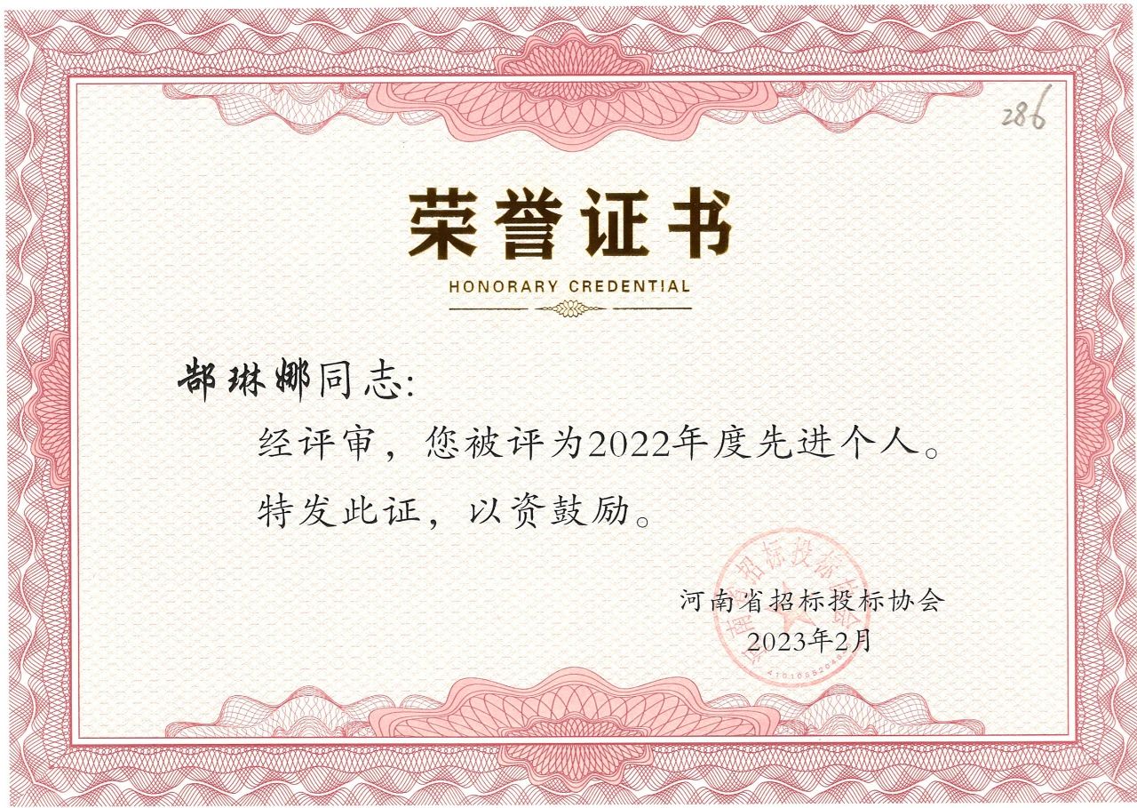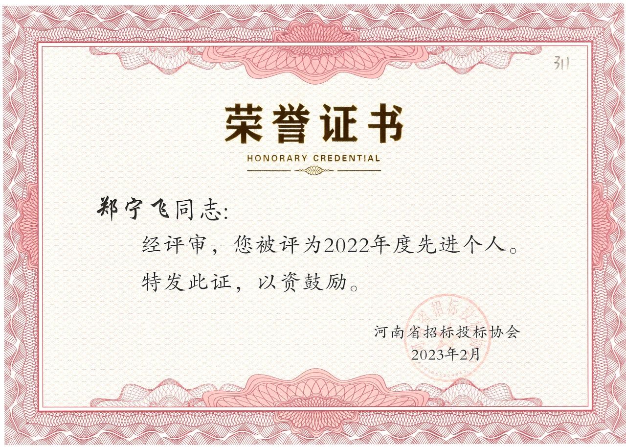 近日,河南省招標(biāo)投標(biāo)協(xié)會(huì)公布了“河南省招標(biāo)投標(biāo)協(xié)會(huì)關(guān)于表彰2022年度先進(jìn)會(huì)員單位、先進(jìn)個(gè)人的決定”。我公司榮獲2022年度先進(jìn)會(huì)員單位榮譽(yù)稱號(hào),八位同志獲得先進(jìn)個(gè)人的榮譽(yù)。