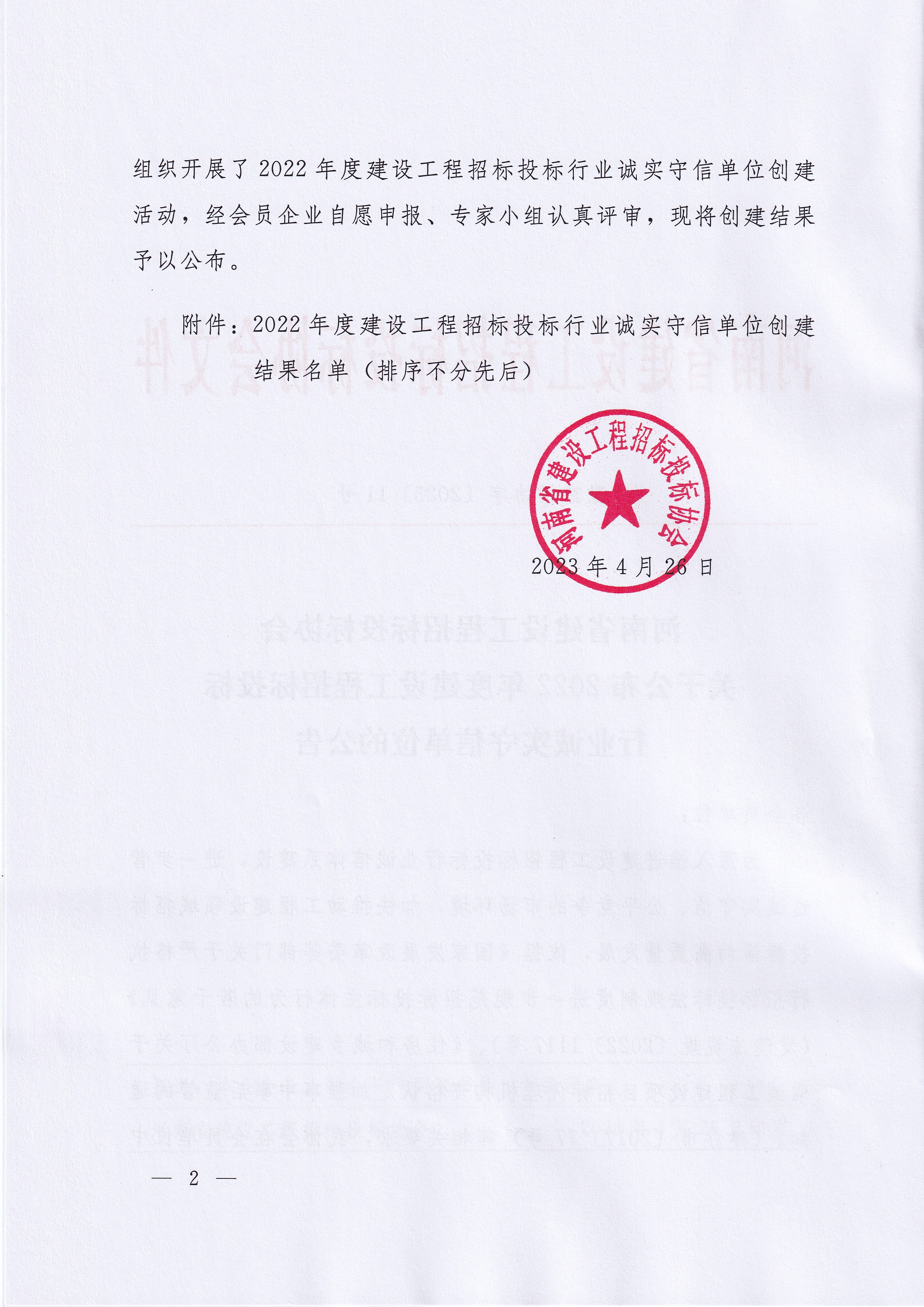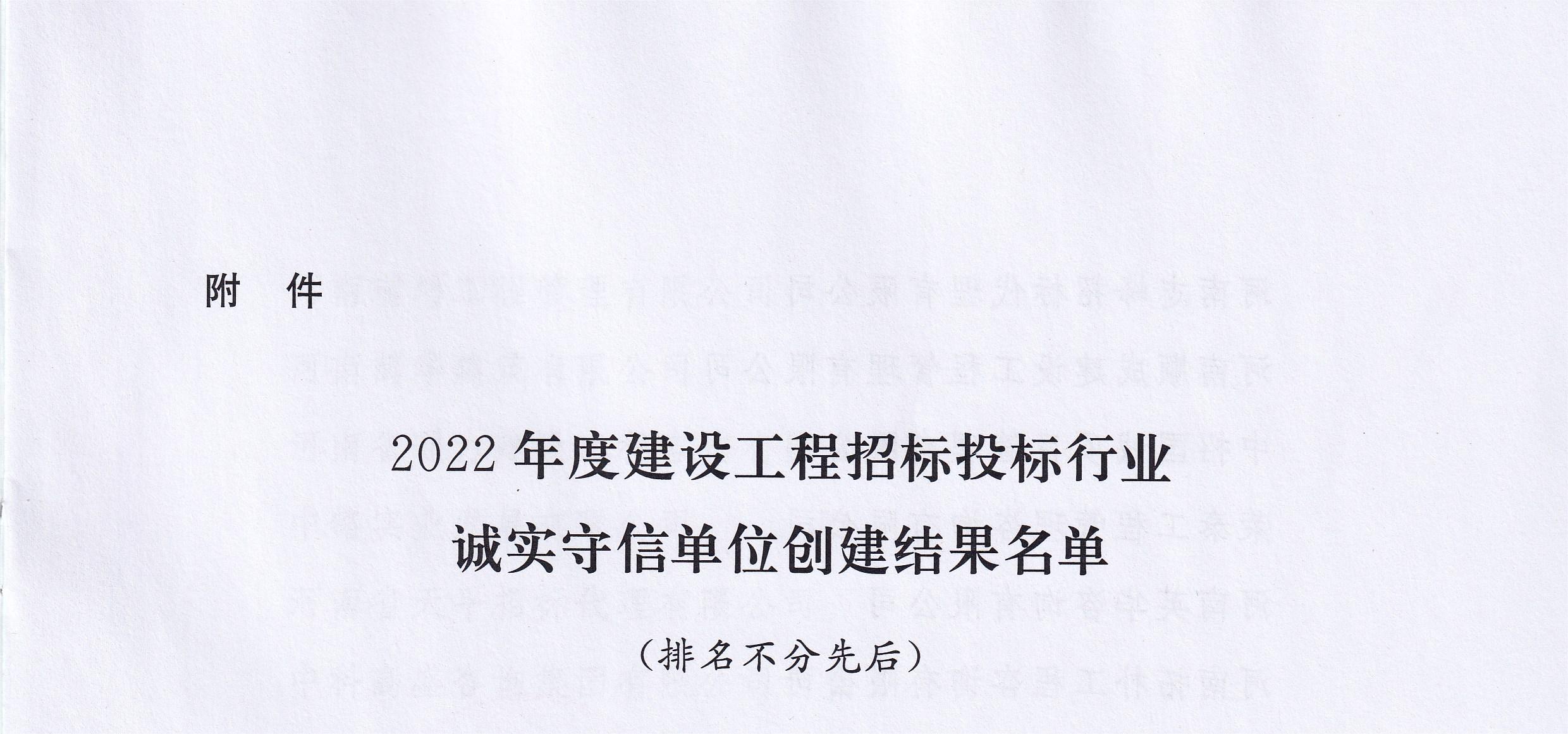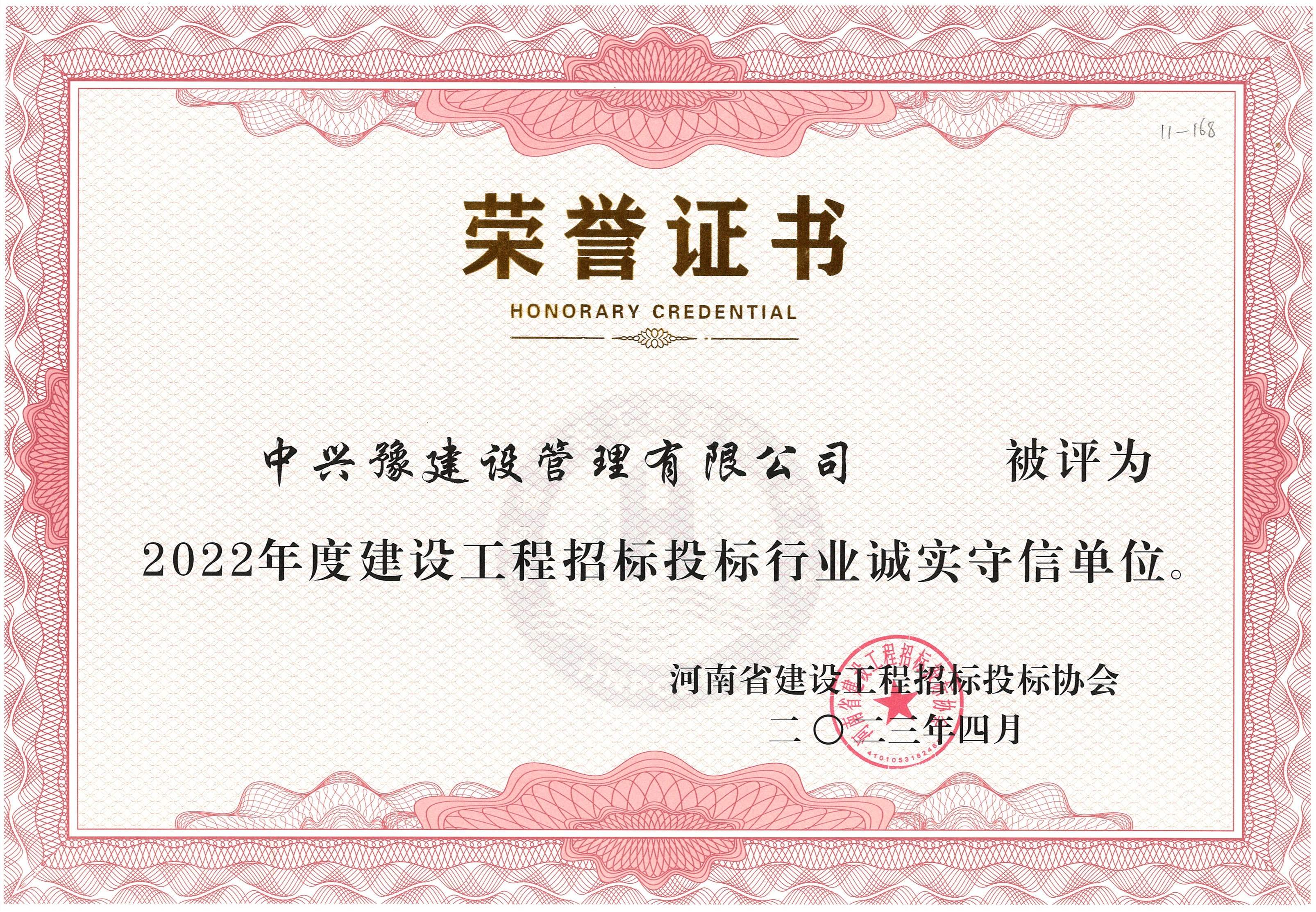 近日,河南省建設(shè)工程招標投標協(xié)會發(fā)布了《河南省建設(shè)工程招標投標協(xié)會關(guān)于公布2022年度建設(shè)工程招標投標行業(yè)誠實守信單位的公告》,中興豫建設(shè)管理有限公司被評為“2022年度河南省建設(shè)工程招標投標行業(yè)誠實守信單位”。