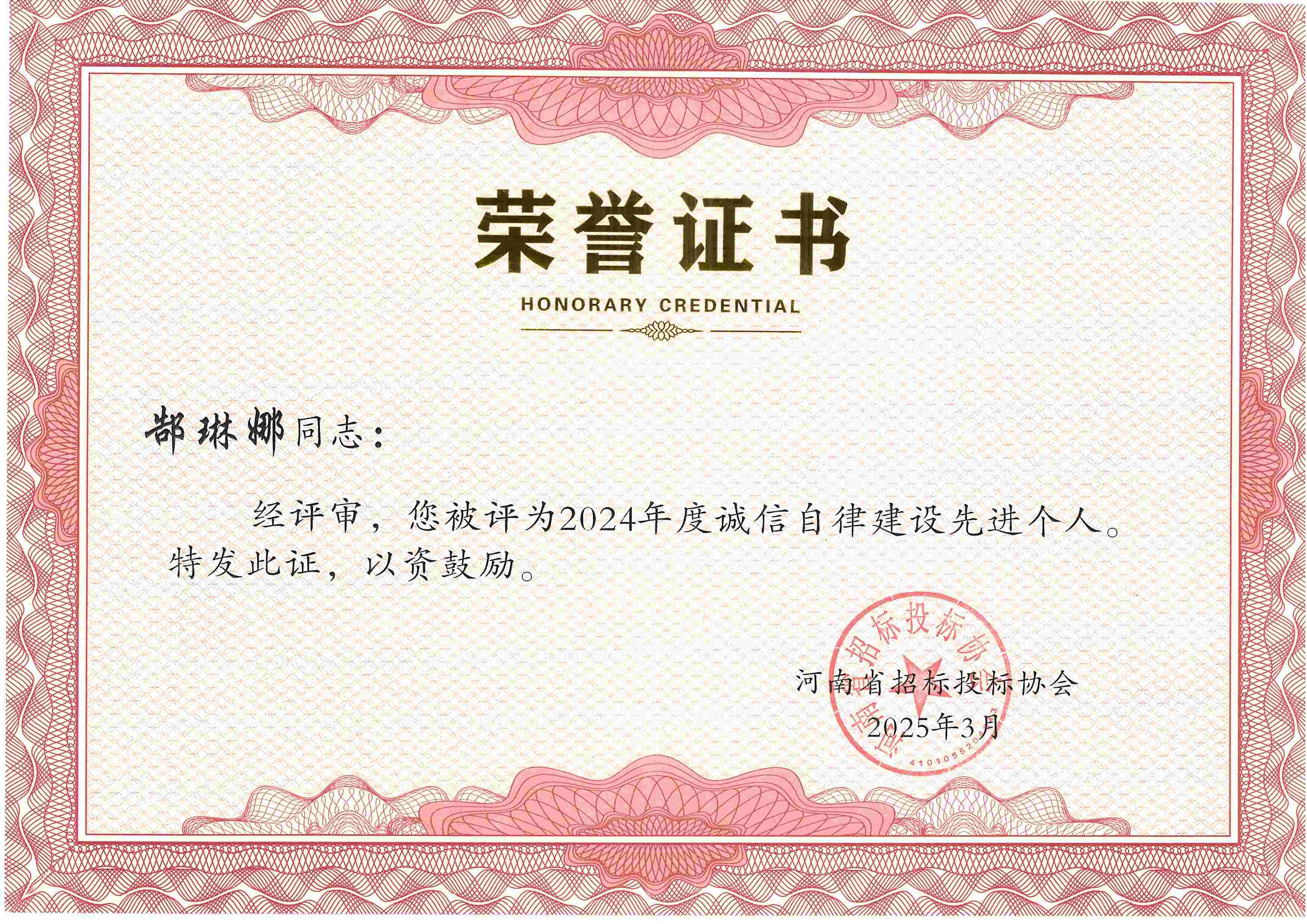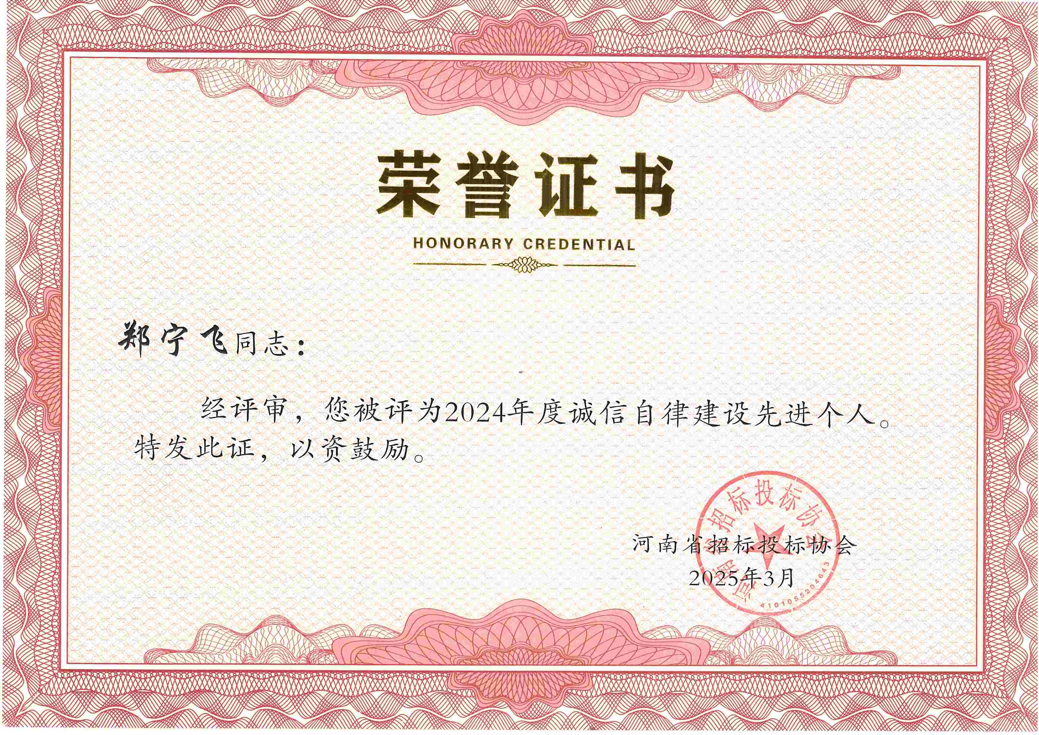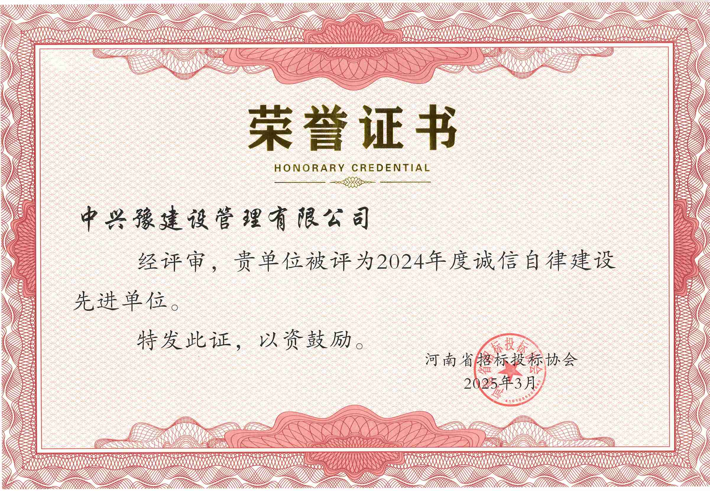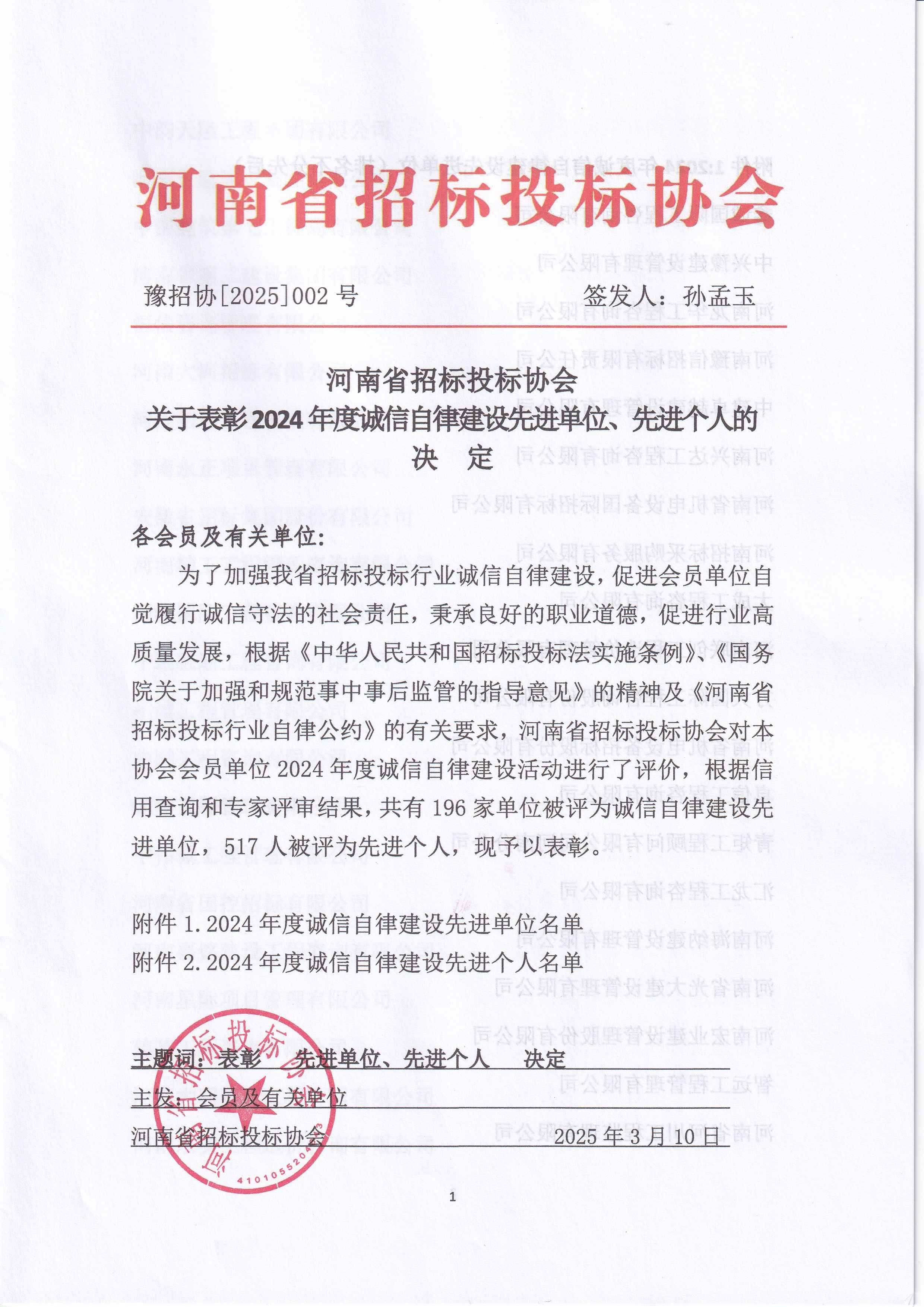 近日,河南省招標投標協(xié)會發(fā)布關于表彰2024年度誠信自律建設先進單位、先進個人的決定。其中,中興豫建設管理有限公司榮幸入選“2024年度誠信自律建設先進單位”。