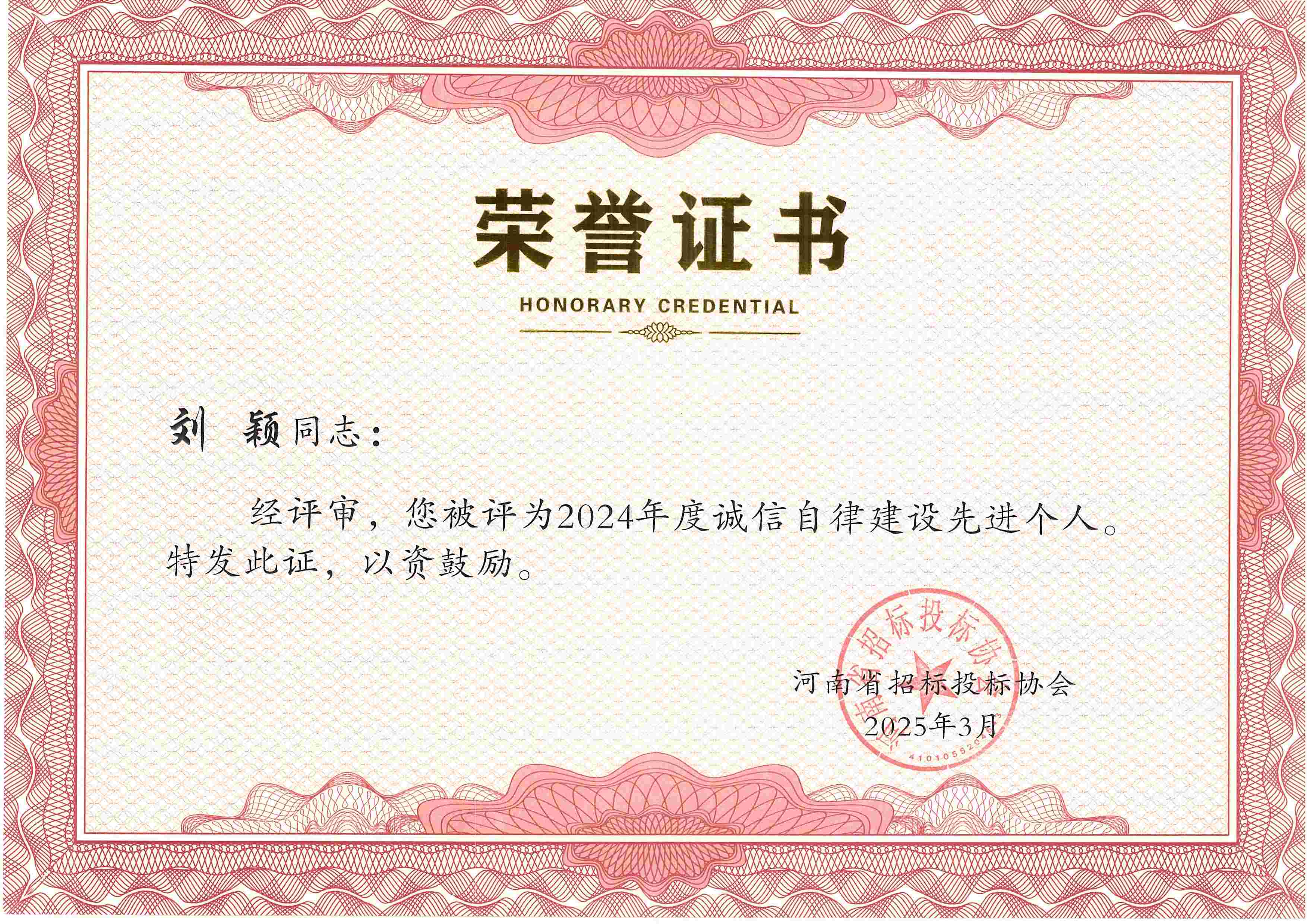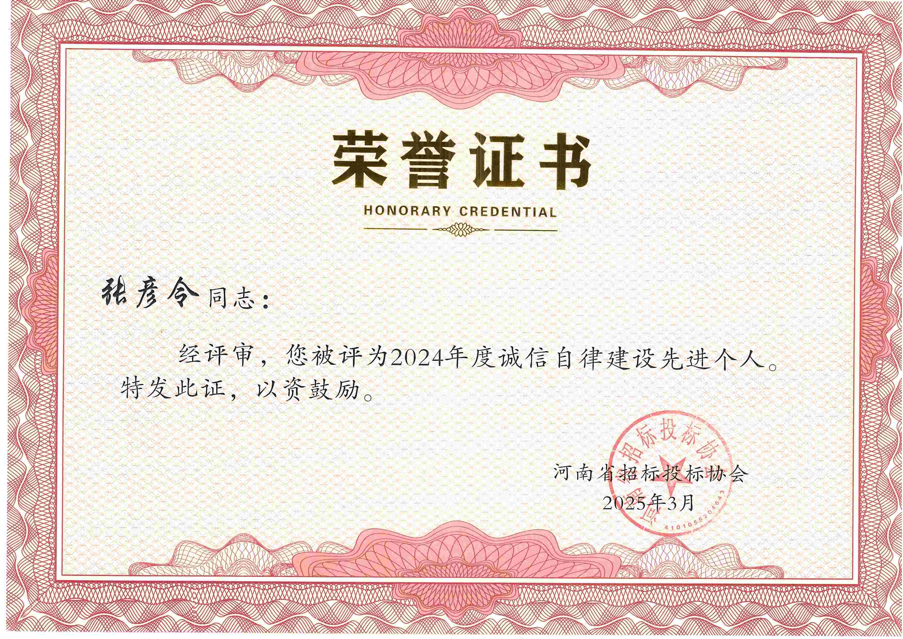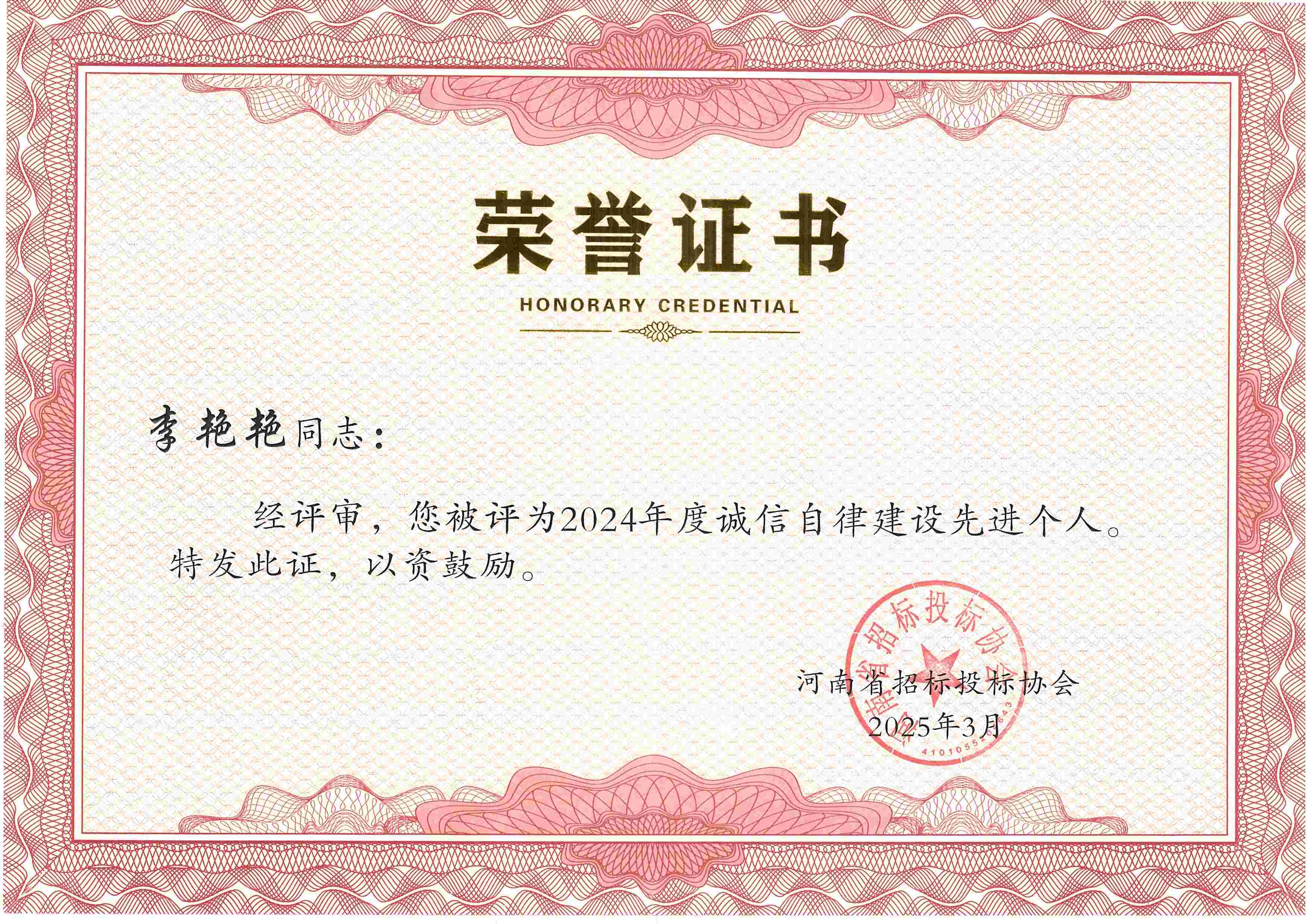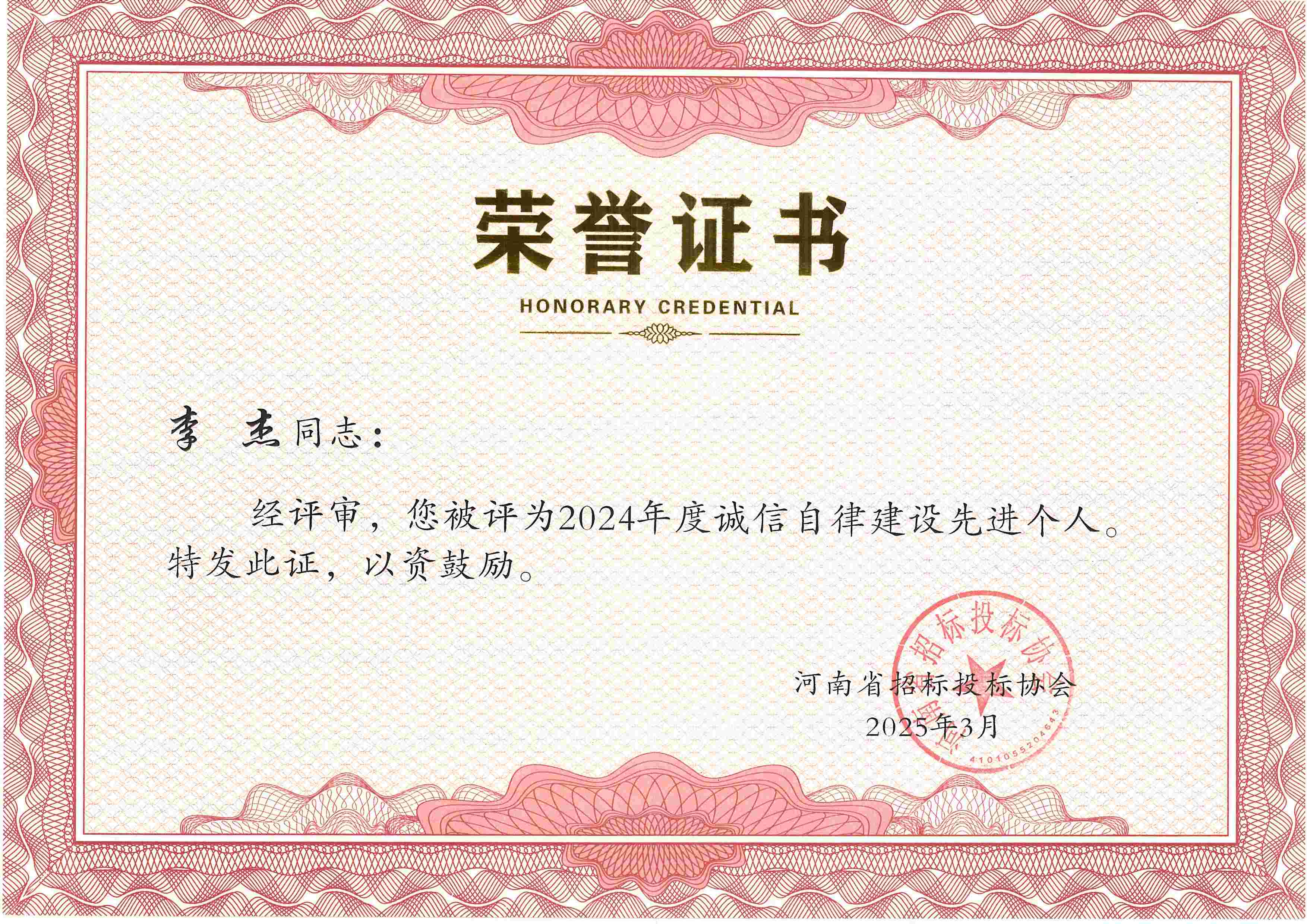 近日,河南省招標投標協(xié)會發(fā)布關于表彰2024年度誠信自律建設先進單位、先進個人的決定。其中,中興豫建設管理有限公司榮幸入選“2024年度誠信自律建設先進單位”。