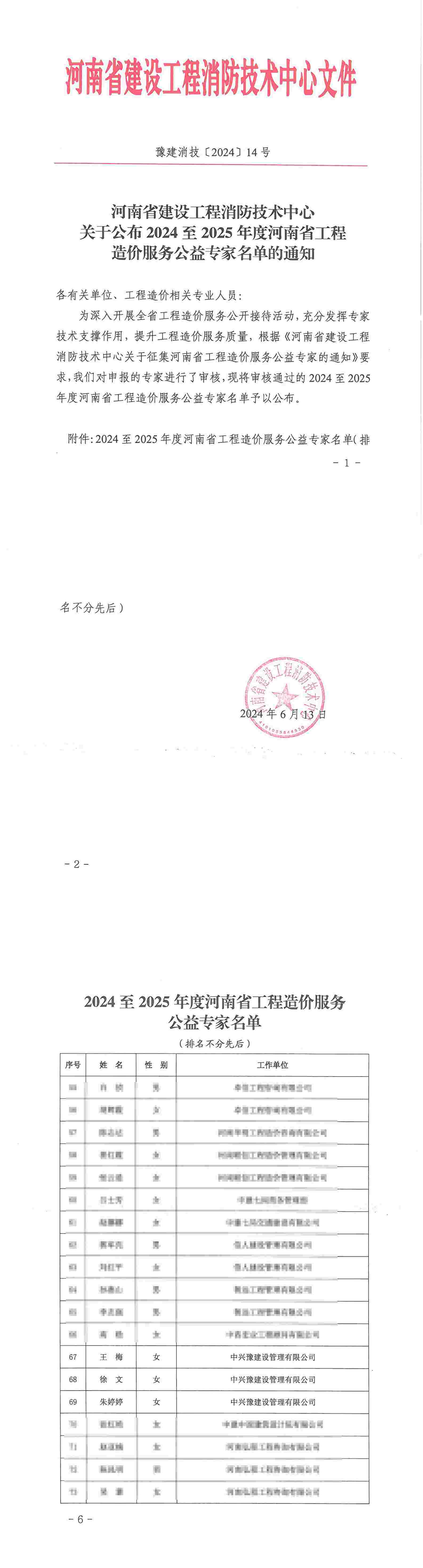 近日,河南省建設(shè)工程消防技術(shù)中心公布了《關(guān)于2024至2025年度河南省工程造價服務(wù)公益專家名單的通知》,中興豫建設(shè)管理有限公司王梅、徐文、朱婷婷三位同志成功入選2024至2025年度河南省工程造價服務(wù)公益專家名單。