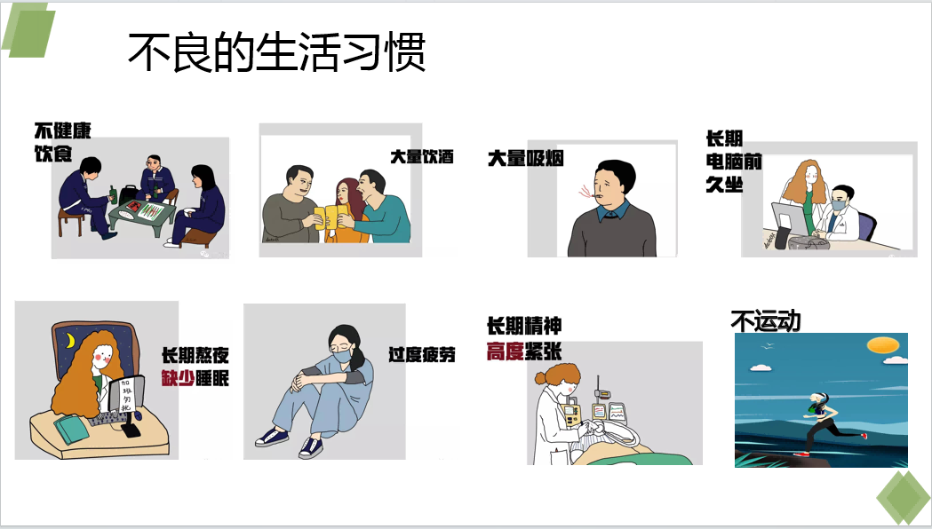 由于現(xiàn)今社會工作壓力大,生活節(jié)奏快等原因,人們在生活中存在以下不良生活習慣:不健康飲食、大量飲酒、大量吸煙、長期電腦前久坐、長期熬夜缺少睡眠、過度疲勞、長期精神高度緊張、缺乏運動等。這些不良生活習慣會導致人們的身體長期處于“亞健康”狀態(tài),從而誘發(fā)一些慢性疾病?,F(xiàn)今“三高”等慢性疾病呈年輕化趨勢,與這些不良生活習慣脫不了干系。
