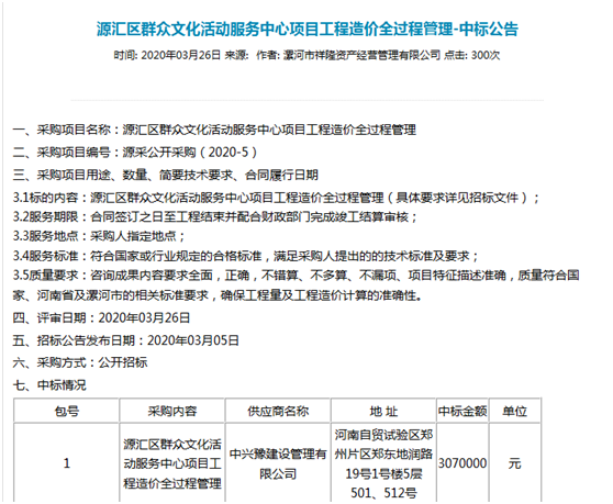 2020年3月26日,中興豫建設(shè)管理有限有限公司在“源匯區(qū)群眾文化活動(dòng)服務(wù)中心項(xiàng)目工程造價(jià)全過(guò)程管理”招投標(biāo)活動(dòng)中成功中標(biāo)。