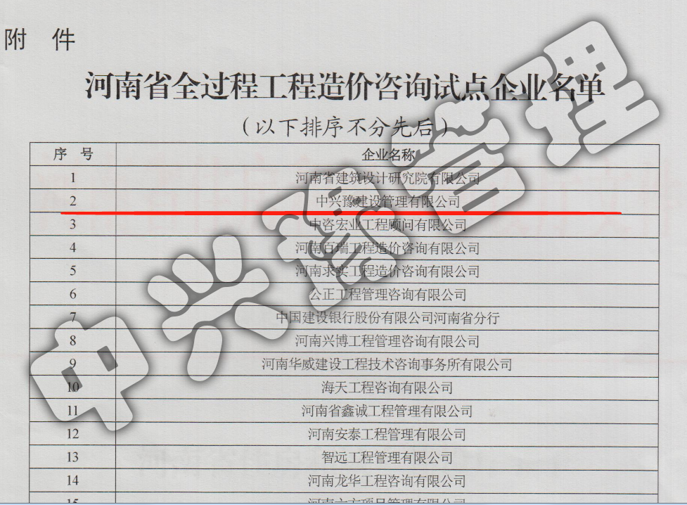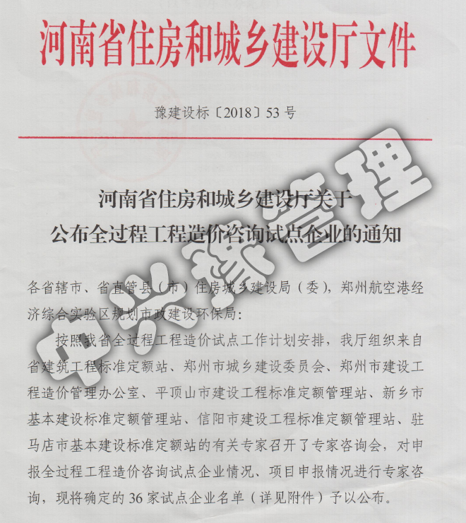 2018河南省住房和城鄉(xiāng)建設(shè)廳關(guān)于公布全過程工程造價咨詢試點企業(yè)文件-公司榮譽