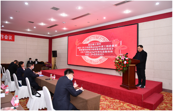副總裁王明軍宣讀《關(guān)于對(duì)獲得2020年度工程質(zhì)量獎(jiǎng)和榮譽(yù)獎(jiǎng)的項(xiàng)目部表彰獎(jiǎng)勵(lì)的決定》、《關(guān)于表彰2020年度先進(jìn)集體和先進(jìn)工作者的決定》,并號(hào)召全體同仁要以受到表彰的先進(jìn)集體和先進(jìn)工作者為榜樣,在學(xué)習(xí)先進(jìn)中提升自我,在對(duì)標(biāo)先進(jìn)中持續(xù)奮斗,在爭(zhēng)當(dāng)先進(jìn)中擔(dān)當(dāng)作為,為中興豫的美好明天貢獻(xiàn)力量!