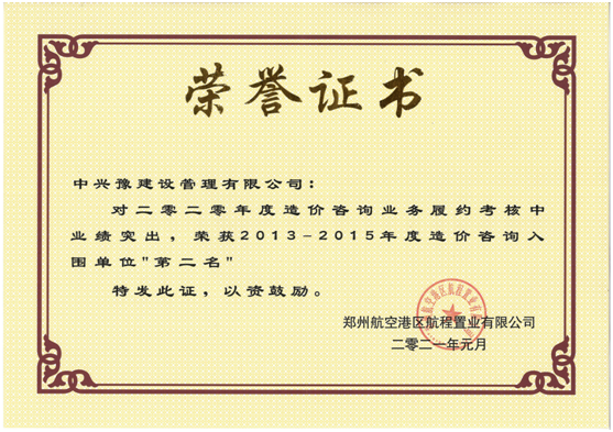 近日,經(jīng)鄭州航空港區(qū)航程置業(yè)有限公司對(duì)2013-2015年度、2015-2017年度、2018-2019年度造價(jià)咨詢?nèi)雵鷨挝坏穆募s情況進(jìn)行嚴(yán)格、公平、公正的考評(píng),中興豫建設(shè)管理有限公司業(yè)績突出,榮獲2013-2015年度造價(jià)咨詢?nèi)雵鷨挝弧暗诙?,并授予榮譽(yù)證書。